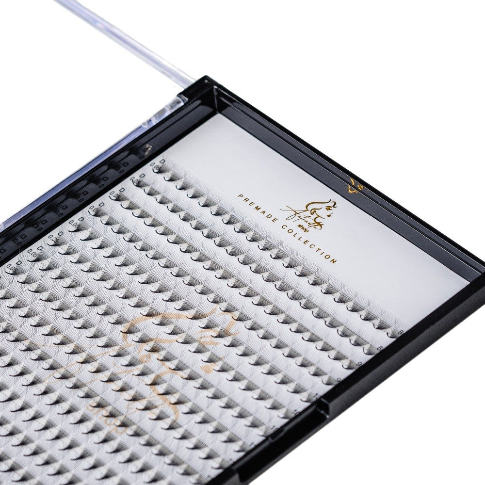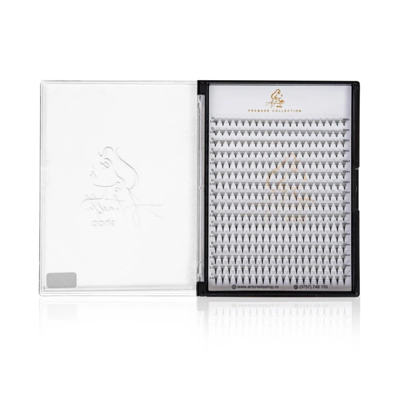 Evantaiele de gene Antonella Premade sunt realizate din fibră PBT de calitate superioară, cu o textură moale și un aspect natural după aplicare. Piciorușele sunt fine, fără exces de adeziv, ceea ce asigură o fixare rapidă și precisă, ideale pentru lash artist-ii care doresc eficiență și rezultate impecabile.