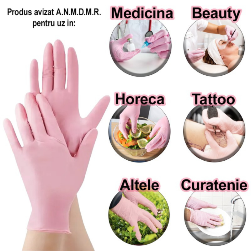 Mănușile din nitril roz sunt alegerea ideală pentru protecție, igienă și confort în diverse domenii de activitate. Fabricate din cauciuc sintetic de nitril, nu conțin pudră și elimină riscul reacțiilor alergice asociate latexului.
